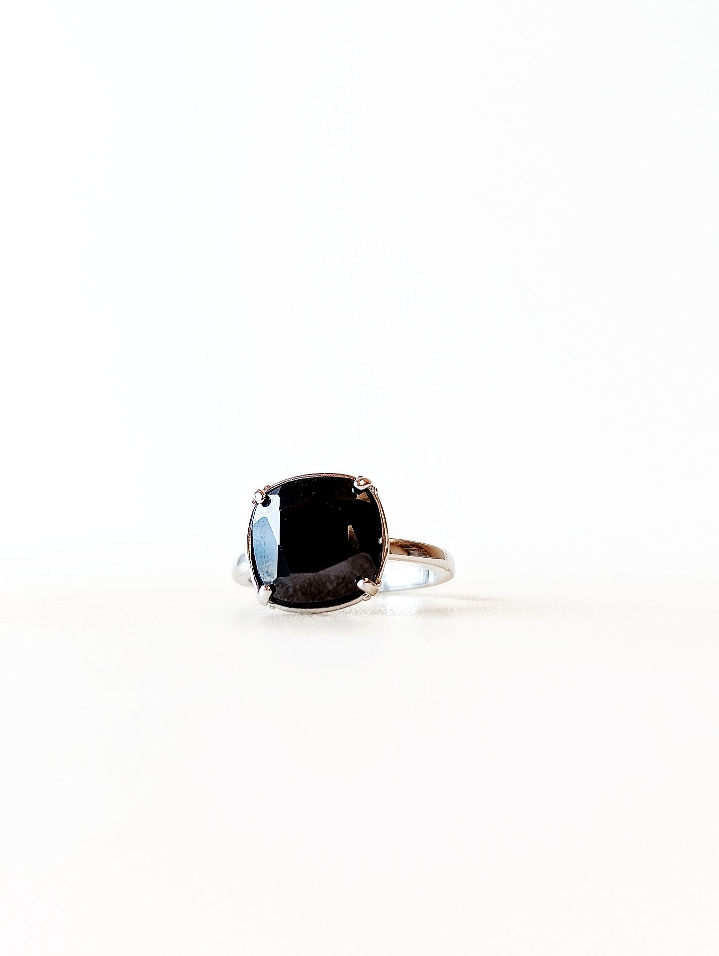 宝石質ブラックスピネルのスクエアファセットカットリングです。 ダイヤモンドに迫る輝きを放つブラックスピネル、テーブル面が輝く様子は圧巻です。