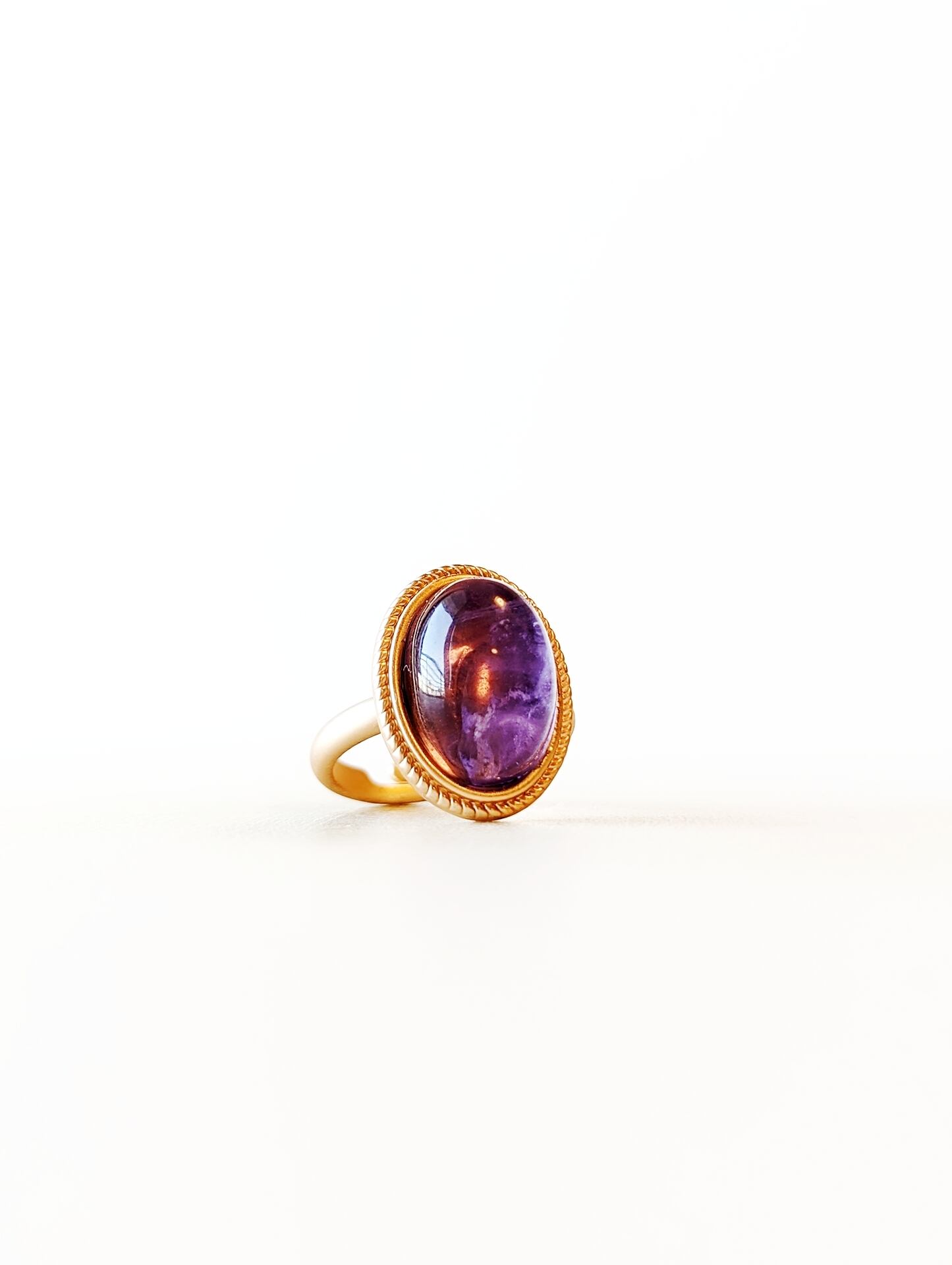 パープルフローライトのオーバル型カボションリングです。 発色が良く透明感のある美しいお品です。多くの粒で紫色単色やバイカラーが見られます。