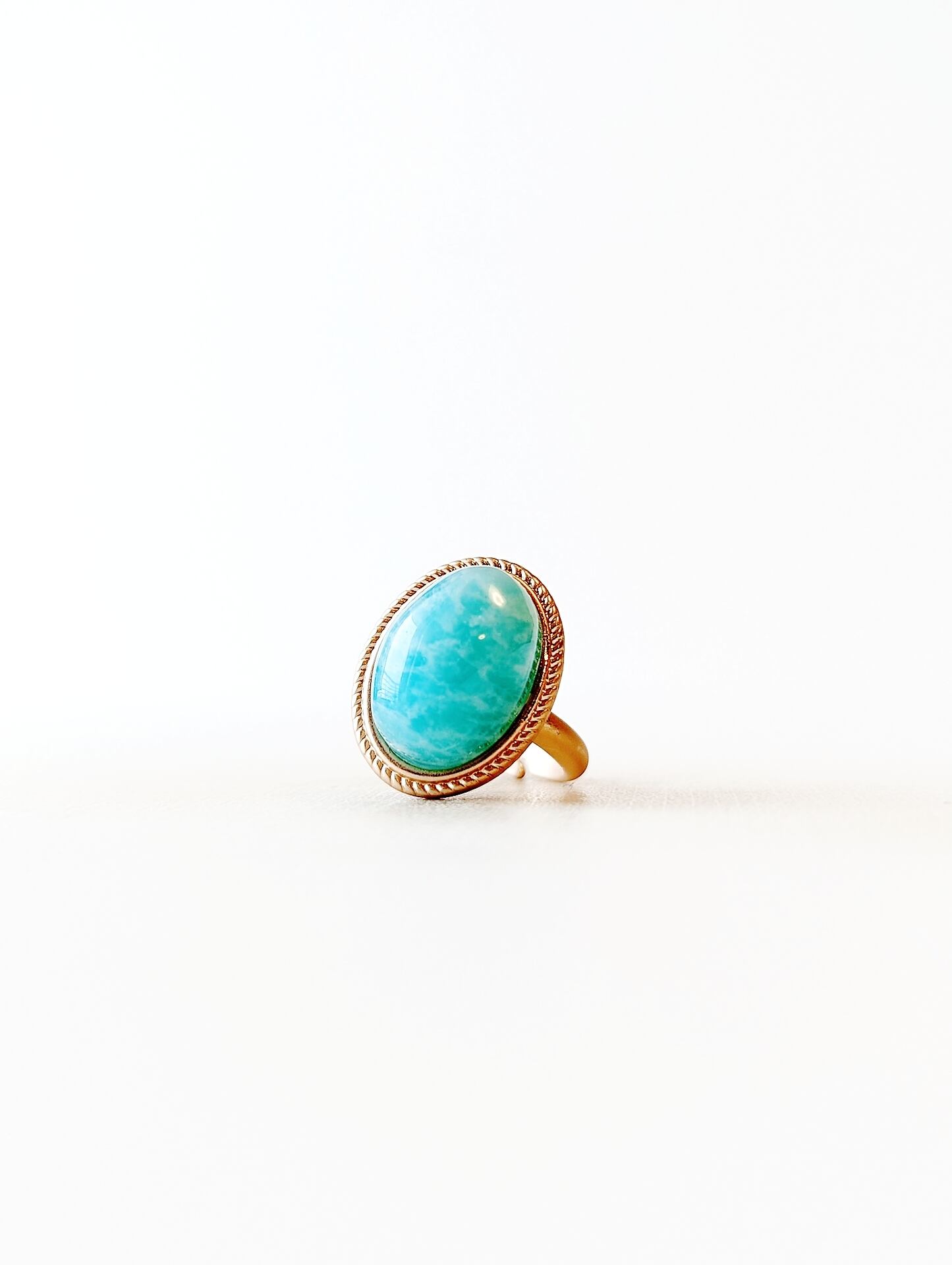 インド産アマゾナイトのオーバル型カボションリングです。 パステル調のブルーグリーンカラーが可愛らしく、うっすら透明感も感じられるお品です。