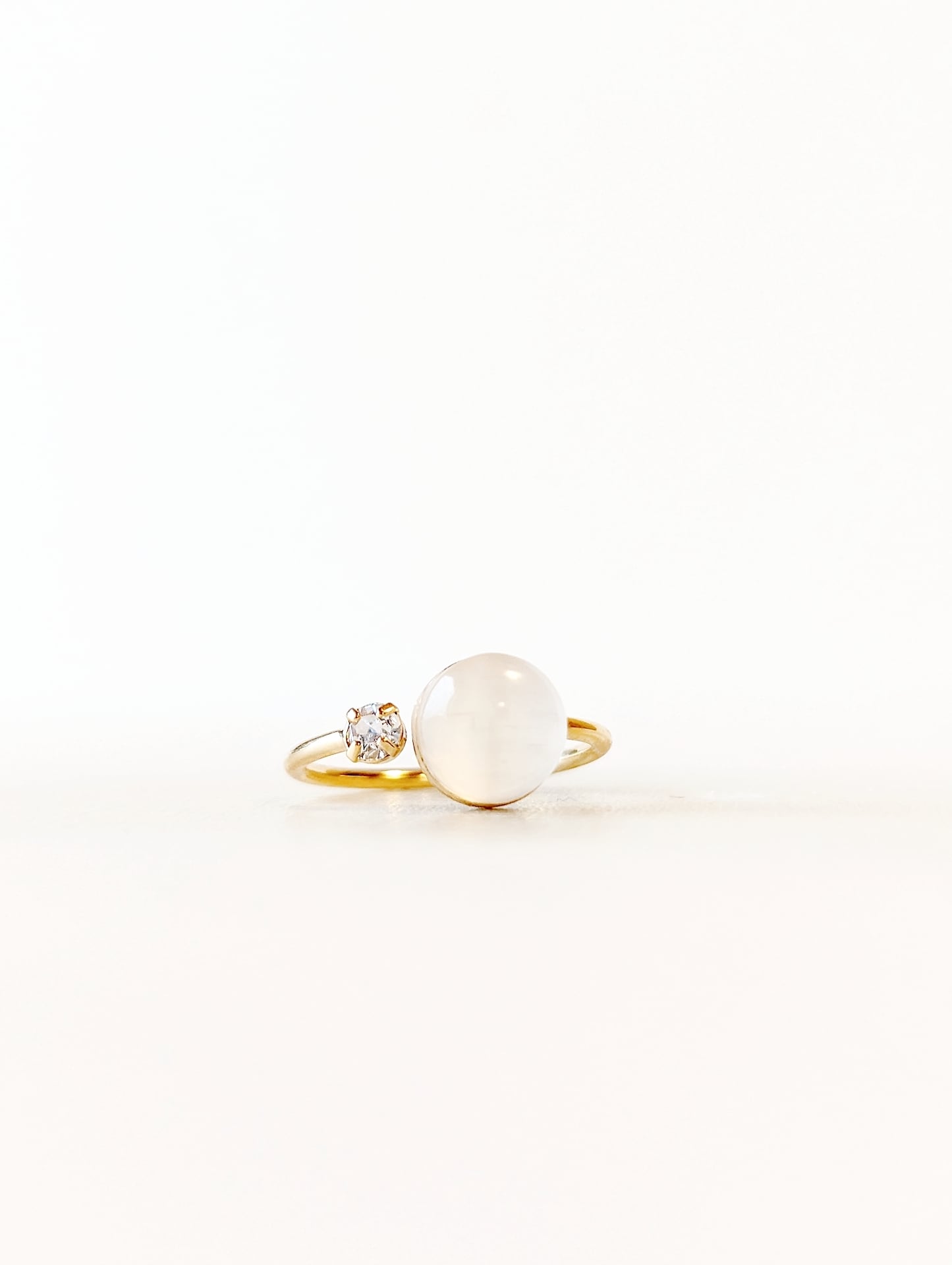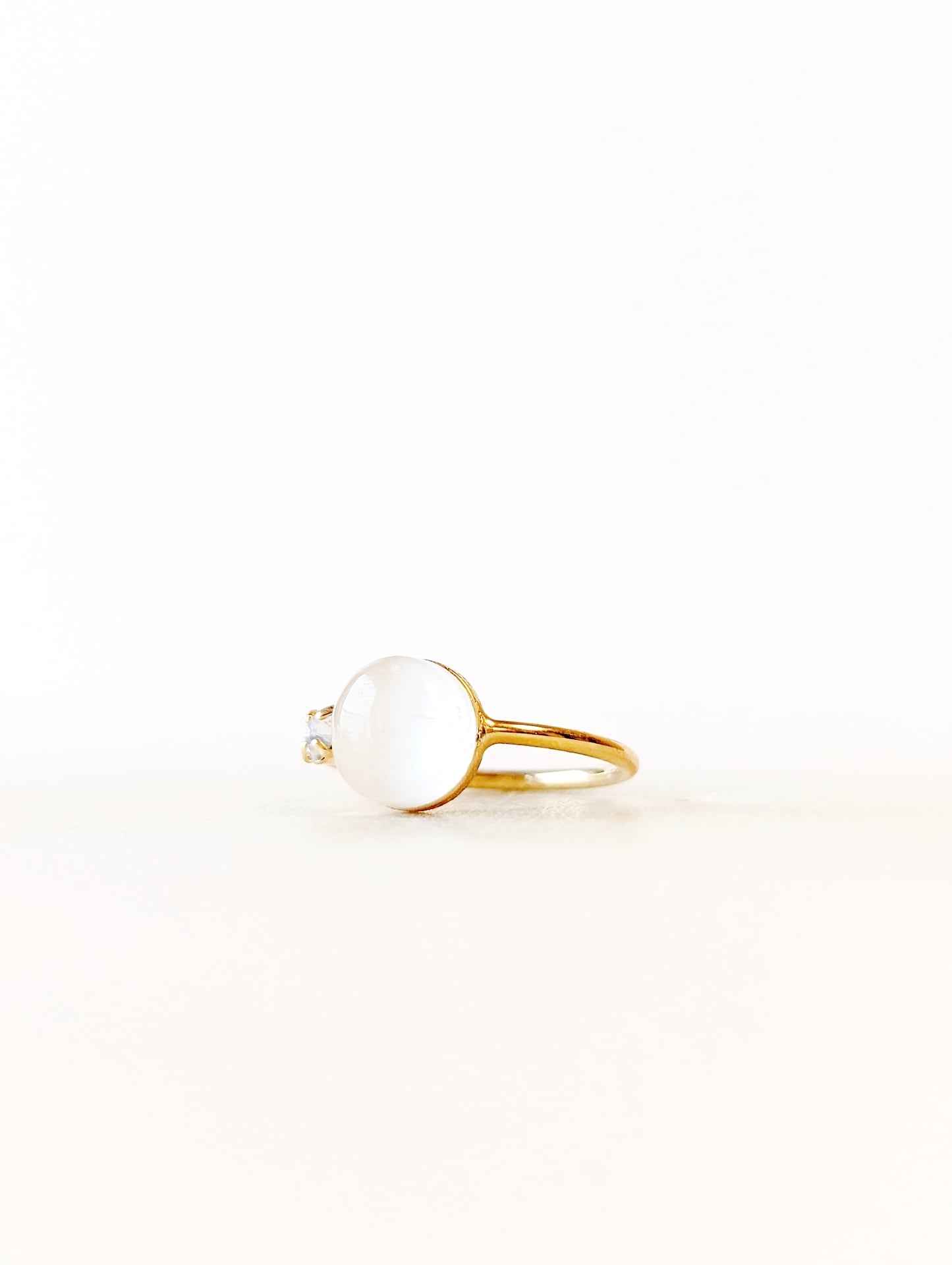 メキシコ産セレナイトのカボションリングです。 「セレナイト」は柔らかく、キャッツ効果が見られる天然石です。 透明感があり、艶感とシラーの輝きが美しいお品です。