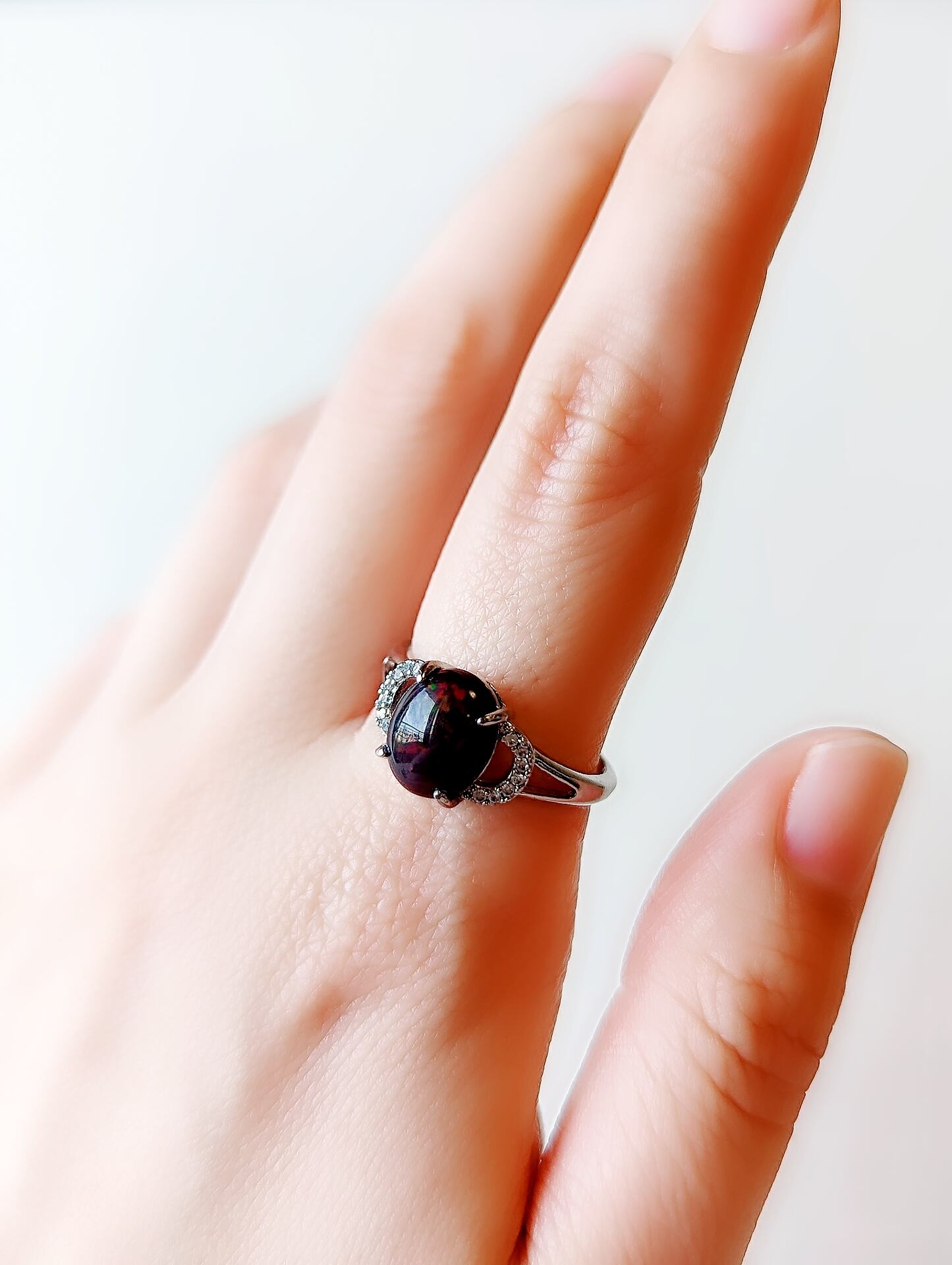 エチオピア産ブラックオパールのオーバルカボションリングです。 ベース色が濃く、角度によって幻想的な遊色効果が見られる高品質なお品です。