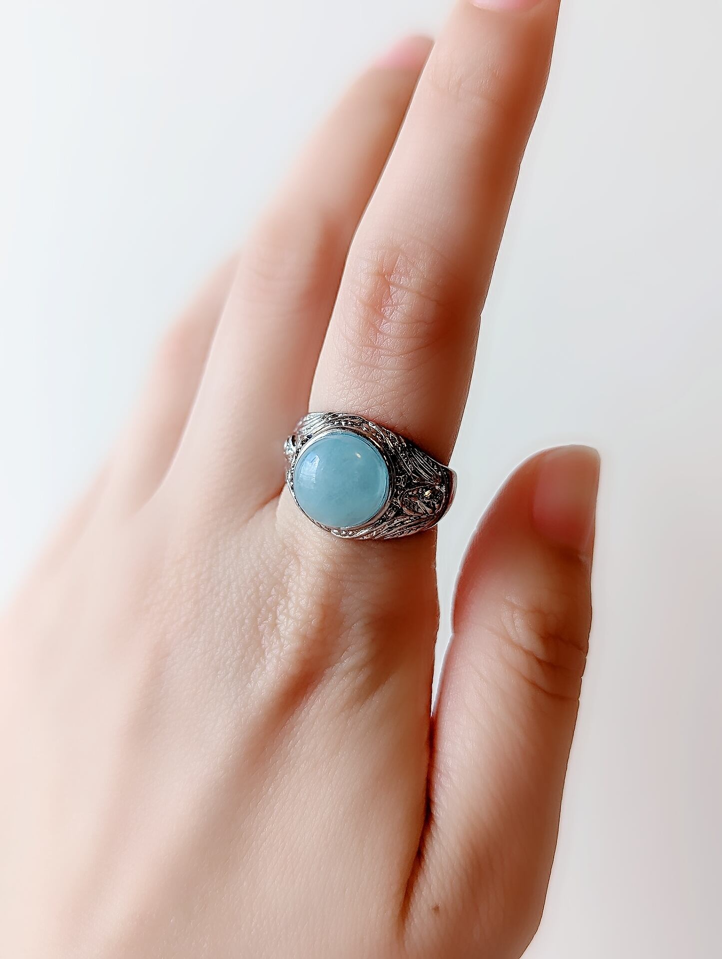 ナミビア産アクアマリンのラウンド型カボションリングです。 透明感のある乳白色のブルーカラーが素敵なお品です。