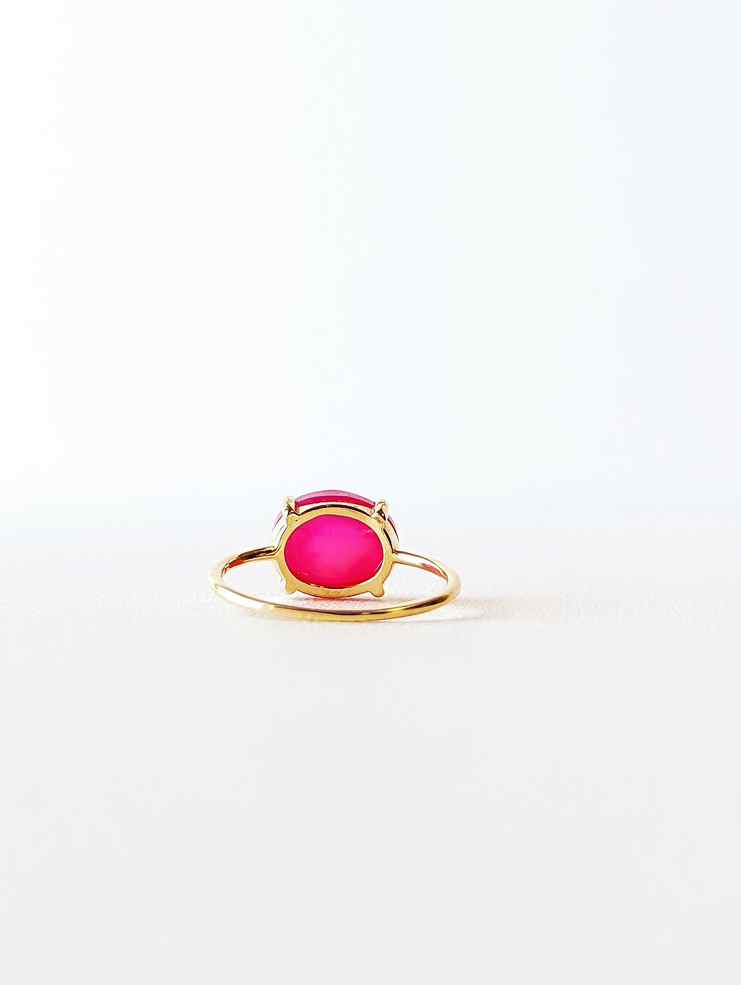 ビビットな色合いが目を引くピンクカルセドニーリングです。 発色が良く、まるでお菓子のゼリーやグミのような可愛らしい色合いが特徴です。