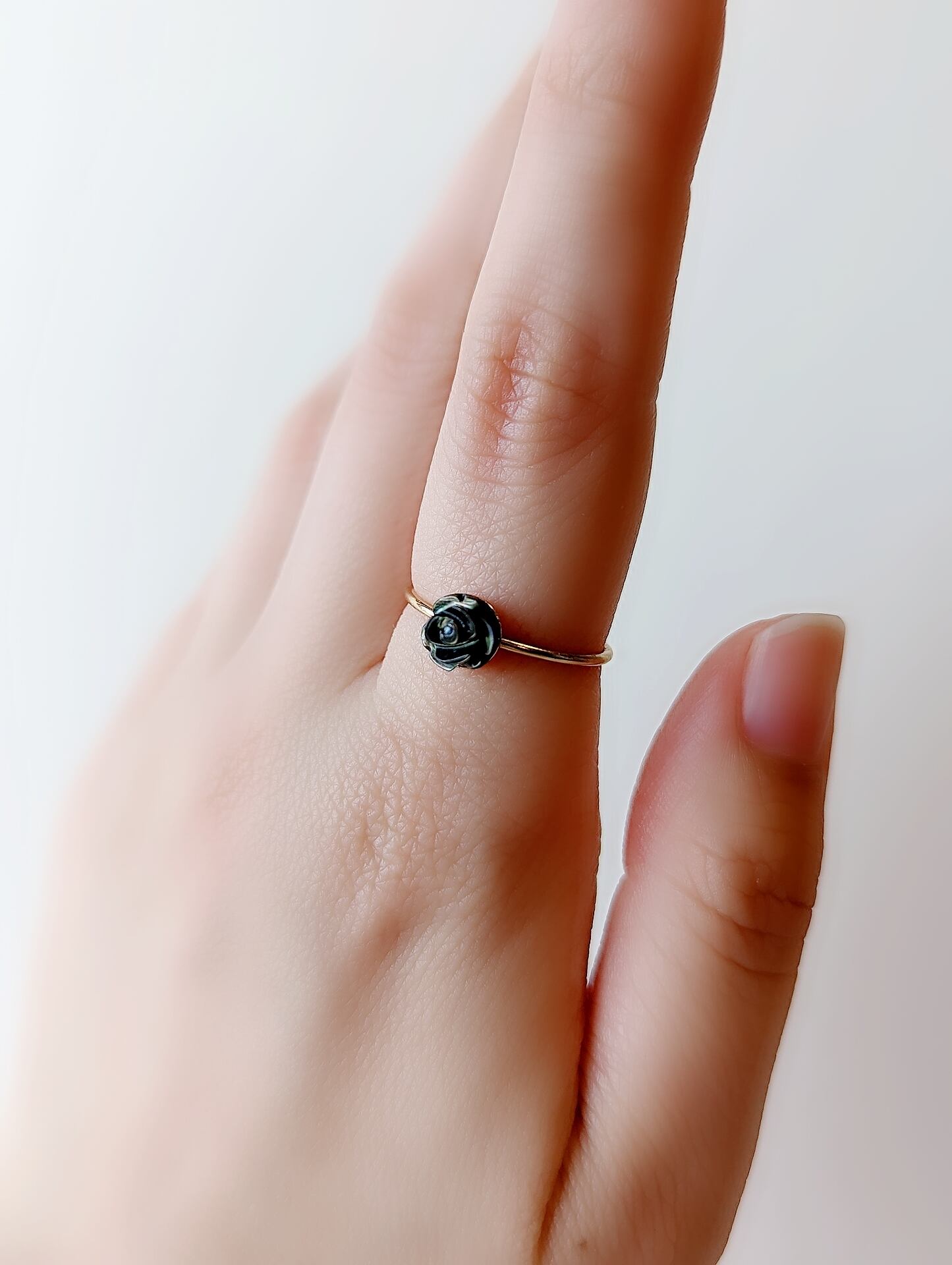 美しいブラックシェル(黒蝶貝)の薔薇リングです。 細かく立体的に施された薔薇の彫刻が美しいお品です