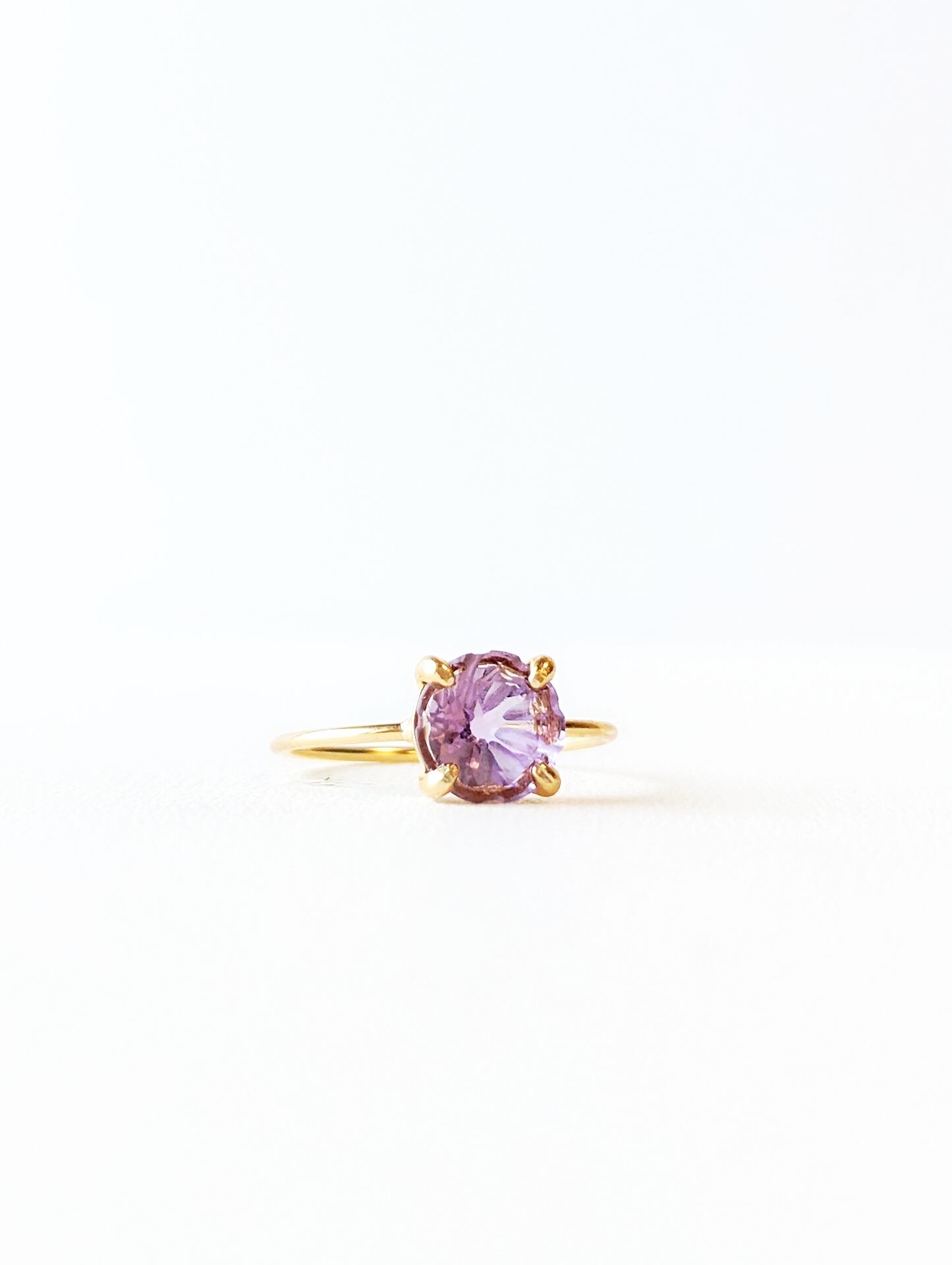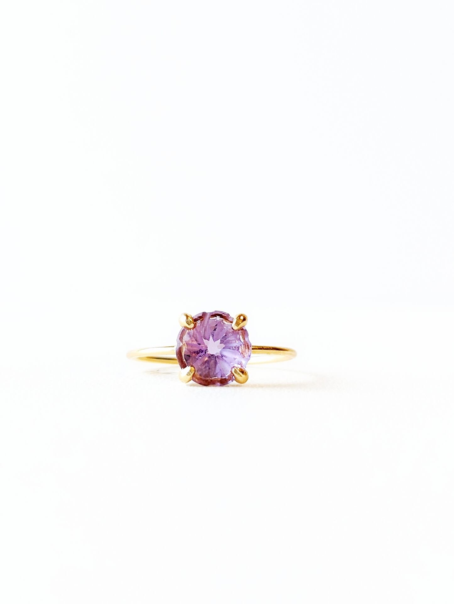 ブラジル産、宝石質アメジストの彫刻入りラウンドファセットカットリングです。 透明度が高く、裏面に施された彫刻が表面に透けて立体感のある仕上がりになっています。ファセットカットの周りが少し花びらみたいな形となっていますが、彫刻入りのカットの特徴となります。