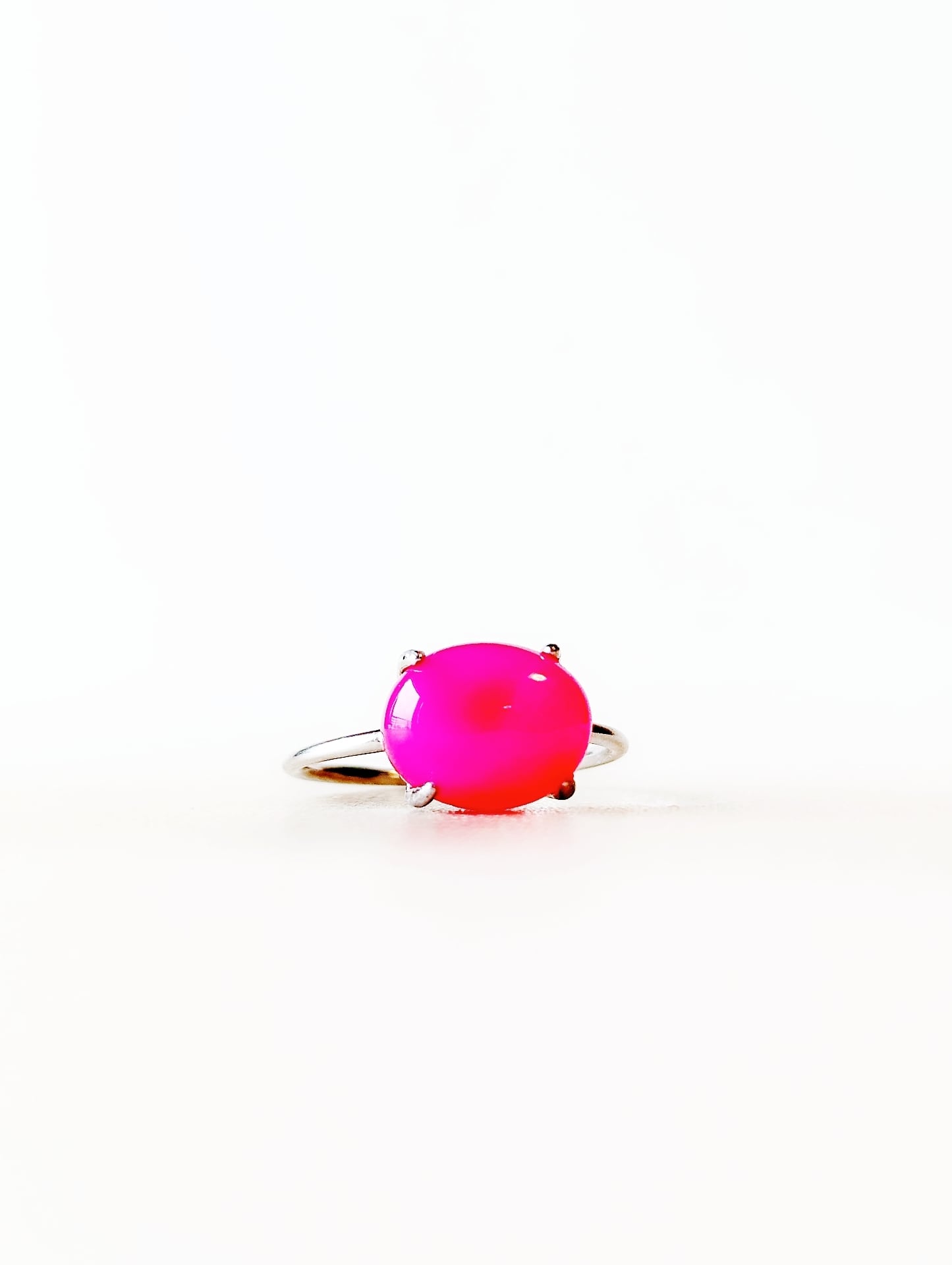 ビビットな色合いが目を引くピンクカルセドニーリングです。 発色が良く、まるでお菓子のゼリーやグミのような可愛らしい色合いが特徴です。