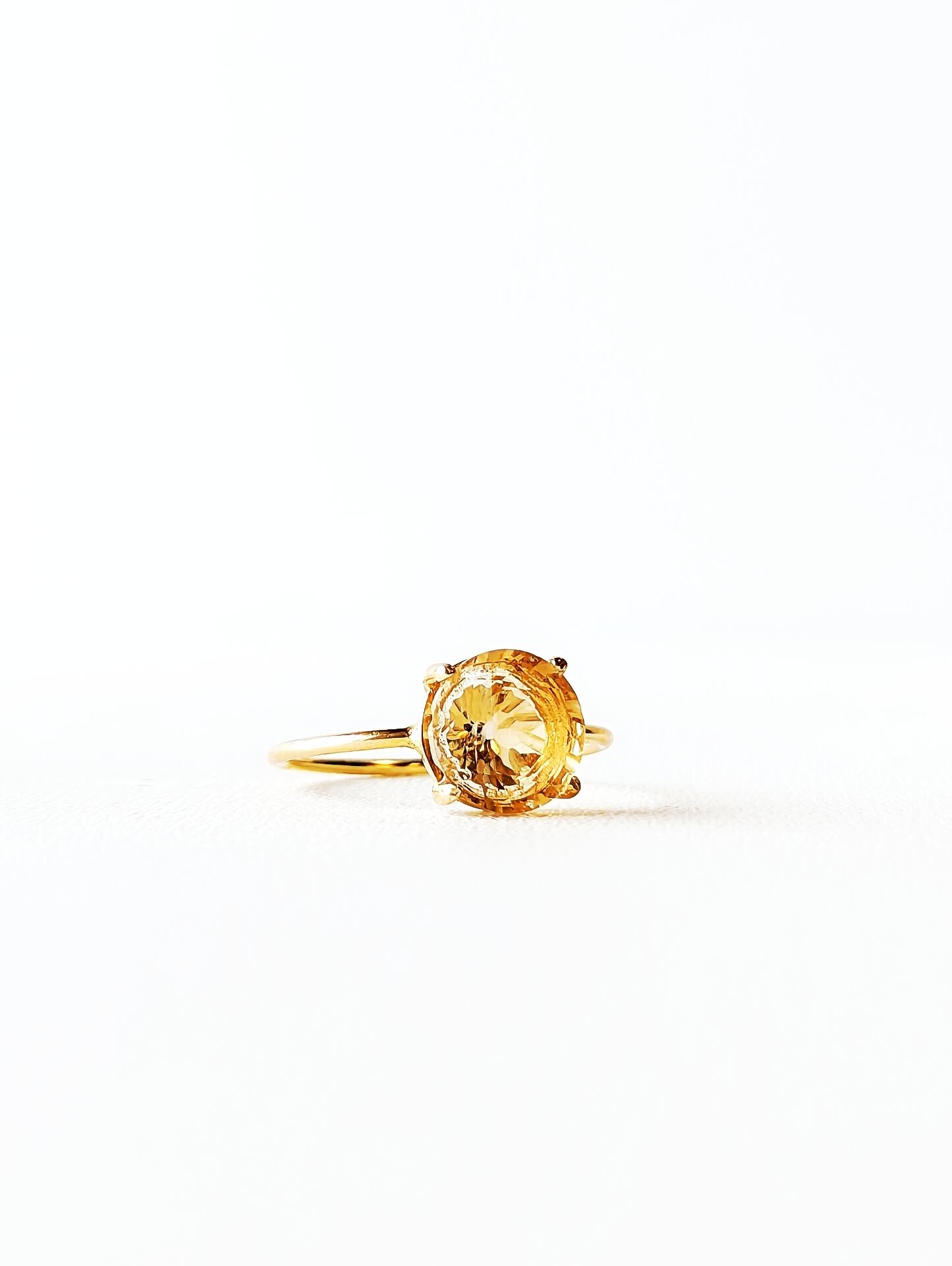 ブラジル産、宝石質シトリンの彫刻入りラウンドファセットカットリングです。 透明度が高く、裏面に施された彫刻が表面に透けて立体感のある仕上がりになっています。ファセットカットの周りが少し花びらみたいな形となっていますが、彫刻入りのカットの特徴となります。