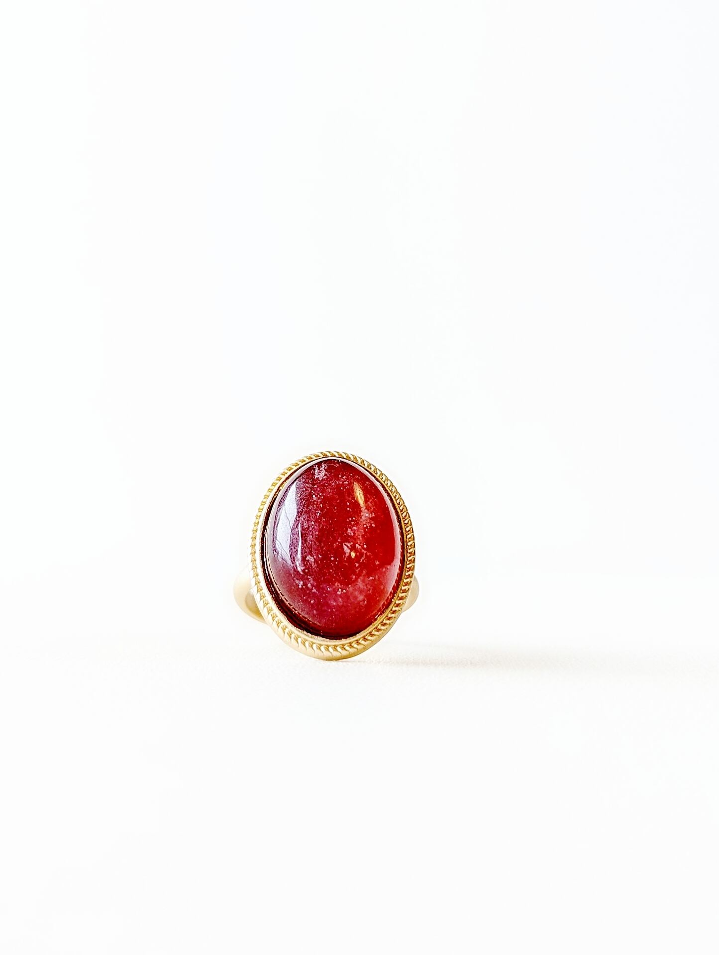 アフリカンレッドアベンチュリンのオーバル型カボションリングです。 透明感のあるベースに赤い内包物がしっかり見られ、角度によって内包物のキラキラとしたアベンチュリン効果も見られます。
